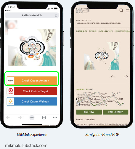 The surprising thing is how much of a difference it makes in Purchase Intent Rate from search by directing to MikMak Commerce experiences over brand product detail pages. For example, results for one product were twice as high as the category benchmark for search, while the lift in purchase intent rate surpassed 500%. It remains to be seen if the novelty of the experience itself is a factor, since testing began with static images. Mock of experience as an example…