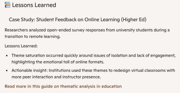 Patterns Reveal Deeper Meaning: Thematic analysis helps uncover recurring ideas, emotions, or concerns that may not be immediately obvious. These patterns often reflect shared experiences or systemic issues that quantitative data might miss.